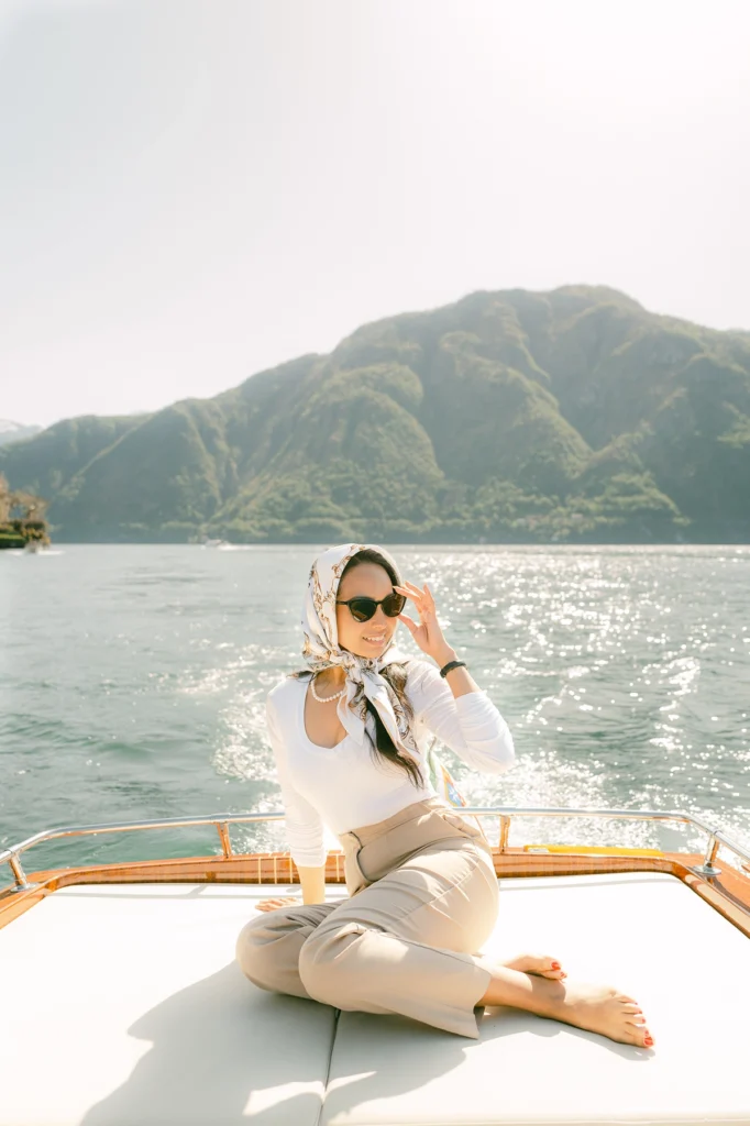 What struck us was how composed she looked — and how completely herself. She had worn a silk scarf tied loosely at her neck, the kind of elegant, practical choice that says everything about a person: beautiful enough for the occasion, and ready for the wind on the water. At some point during the boat ride, she moved it up to protect her hair, and somehow that made the whole scene even more effortlessly stylish.
